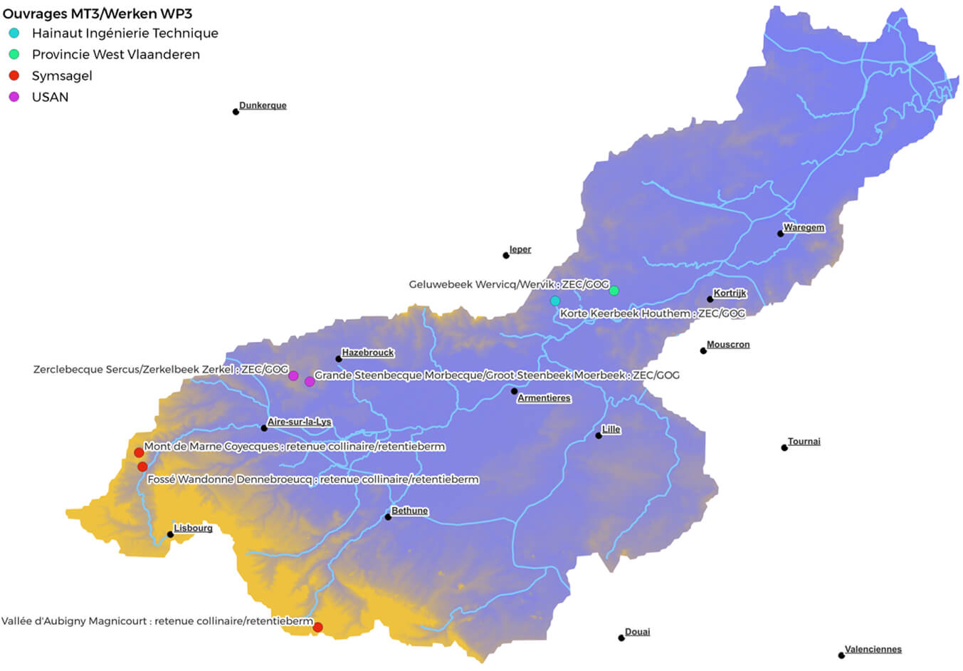 – ZEC sur la Grande Steenbecque à Morbeque (lieu-dit du Romarin) : Repose sur le stockage complémentaire d’eau en amont d’une digue en travers du lit majeur et du cours d’eau. L’ouvrage est dimensionné pour un volume de tamponnement de 50 000 m³, permettant de protéger les habitants de Steenbecque et de Morbecque vis-à-vis des crues vicennales et inférieures.